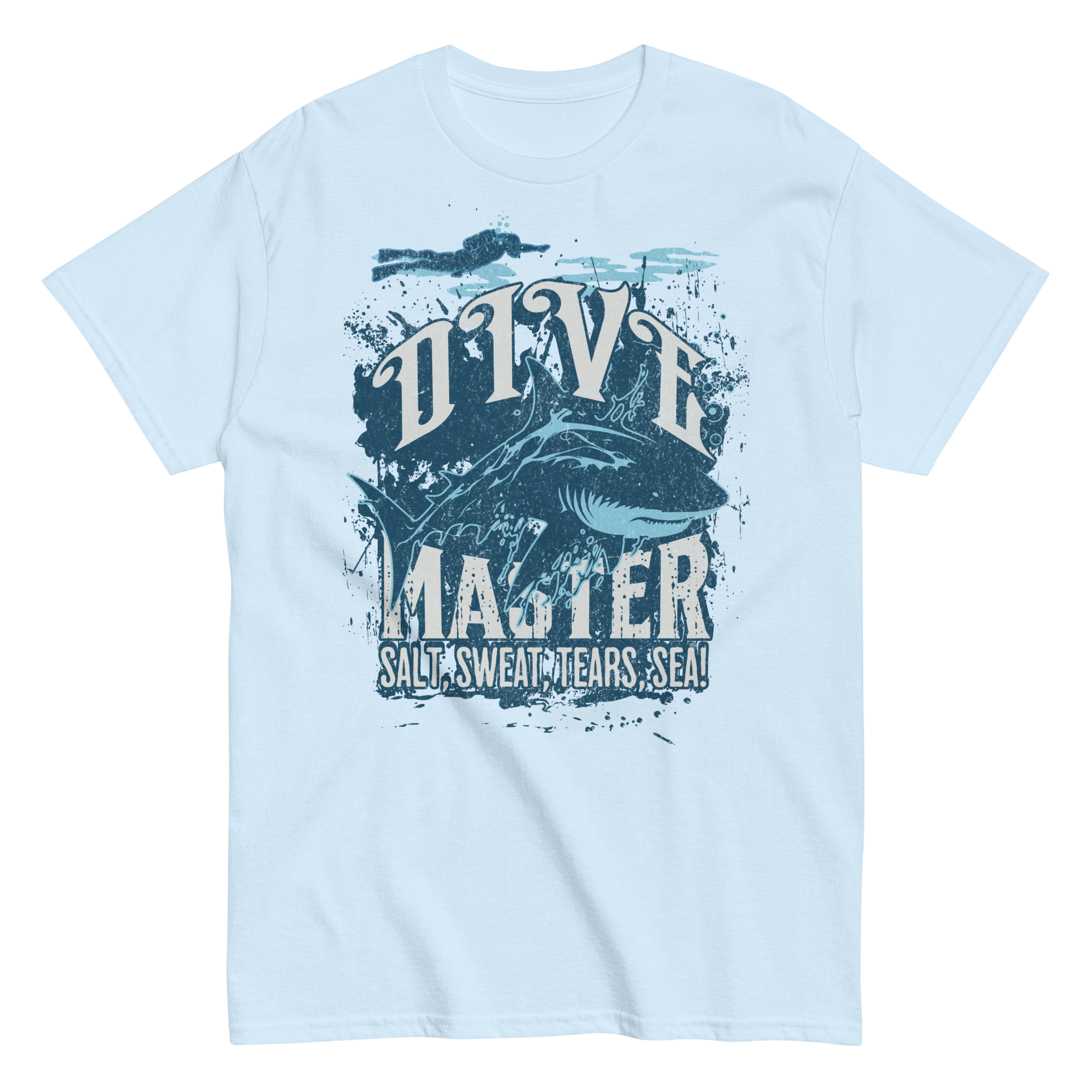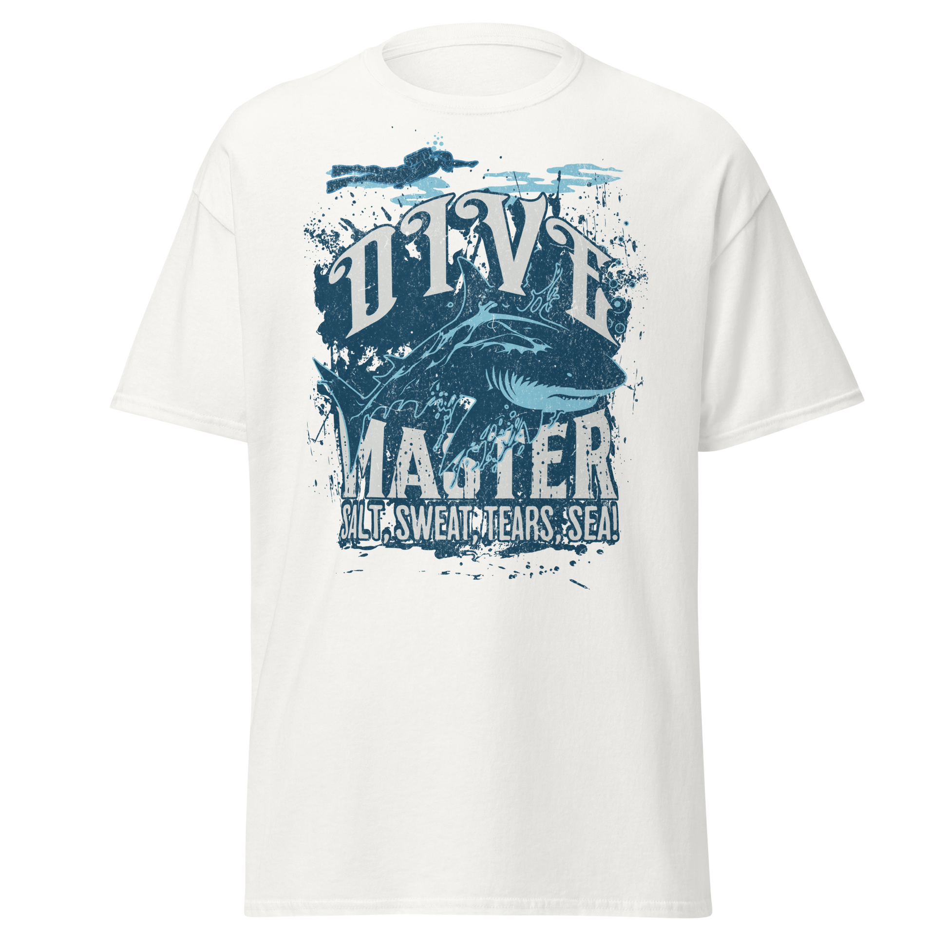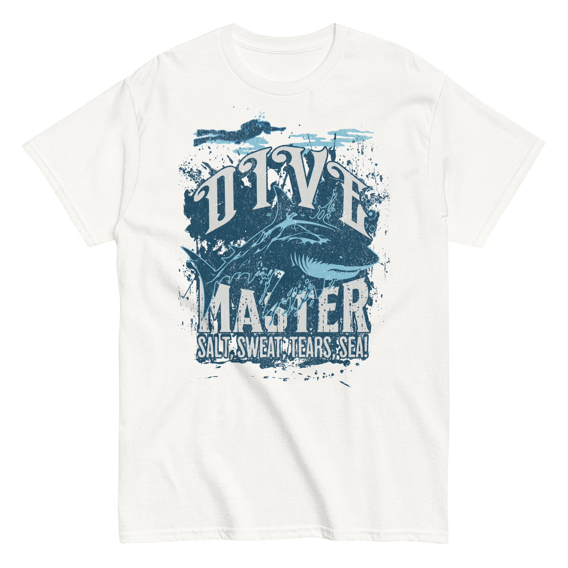 This T-shirt is perfect for any diving enthusiast or professional. It features a bold and eye-catching design with the words "Dive Master" printed prominently across the chest in sleek, stylish font. Below the text, there's an impressive image of a shark, beautifully illustrated to capture its power and grace. The shark appears as if it's swimming towards the viewer, with its fin cutting through the water, creating a dynamic sense of movement. Made from soft, breathable cotton, this T-shirt is both comfortable and durable, ideal for everyday wear or as a statement piece on your next dive trip.