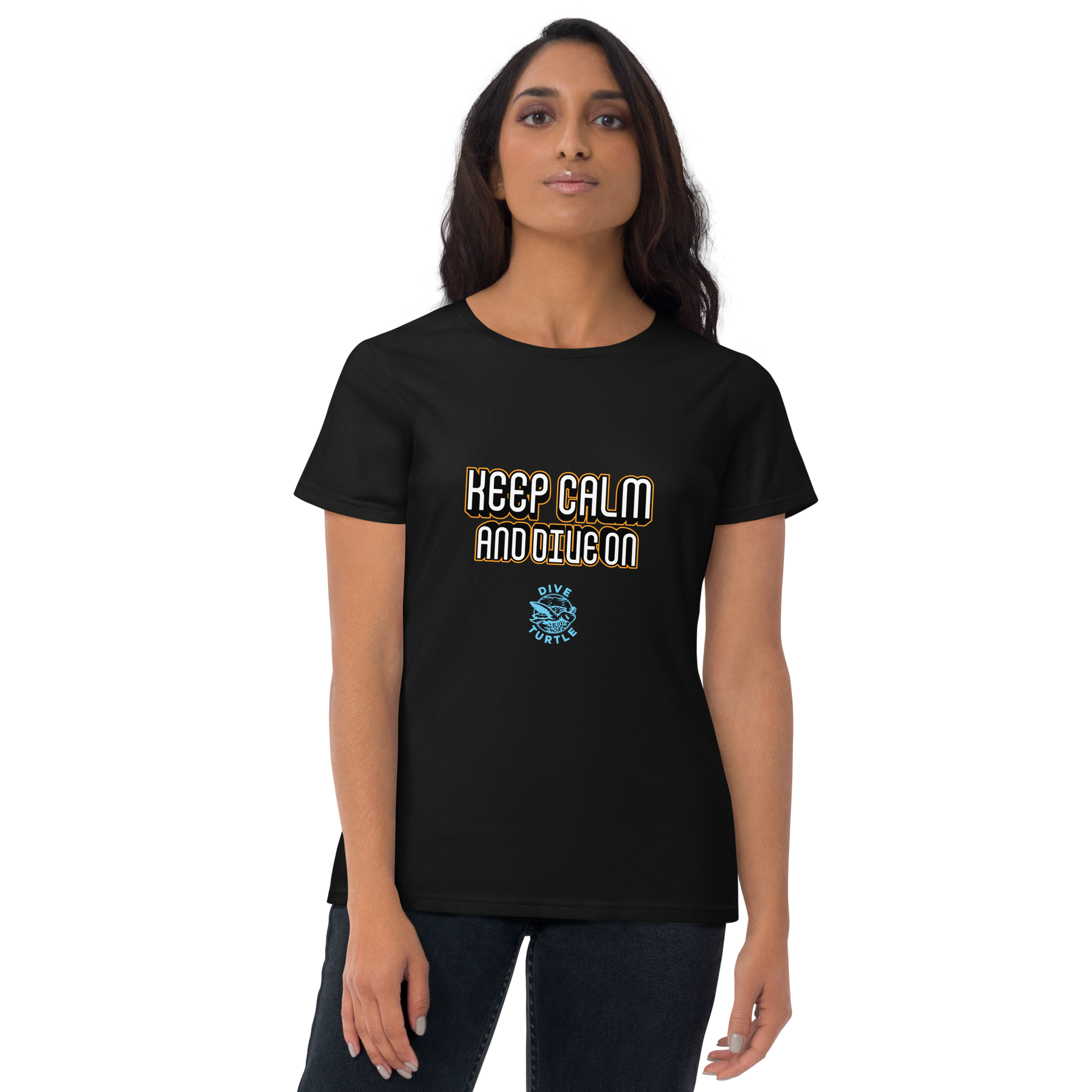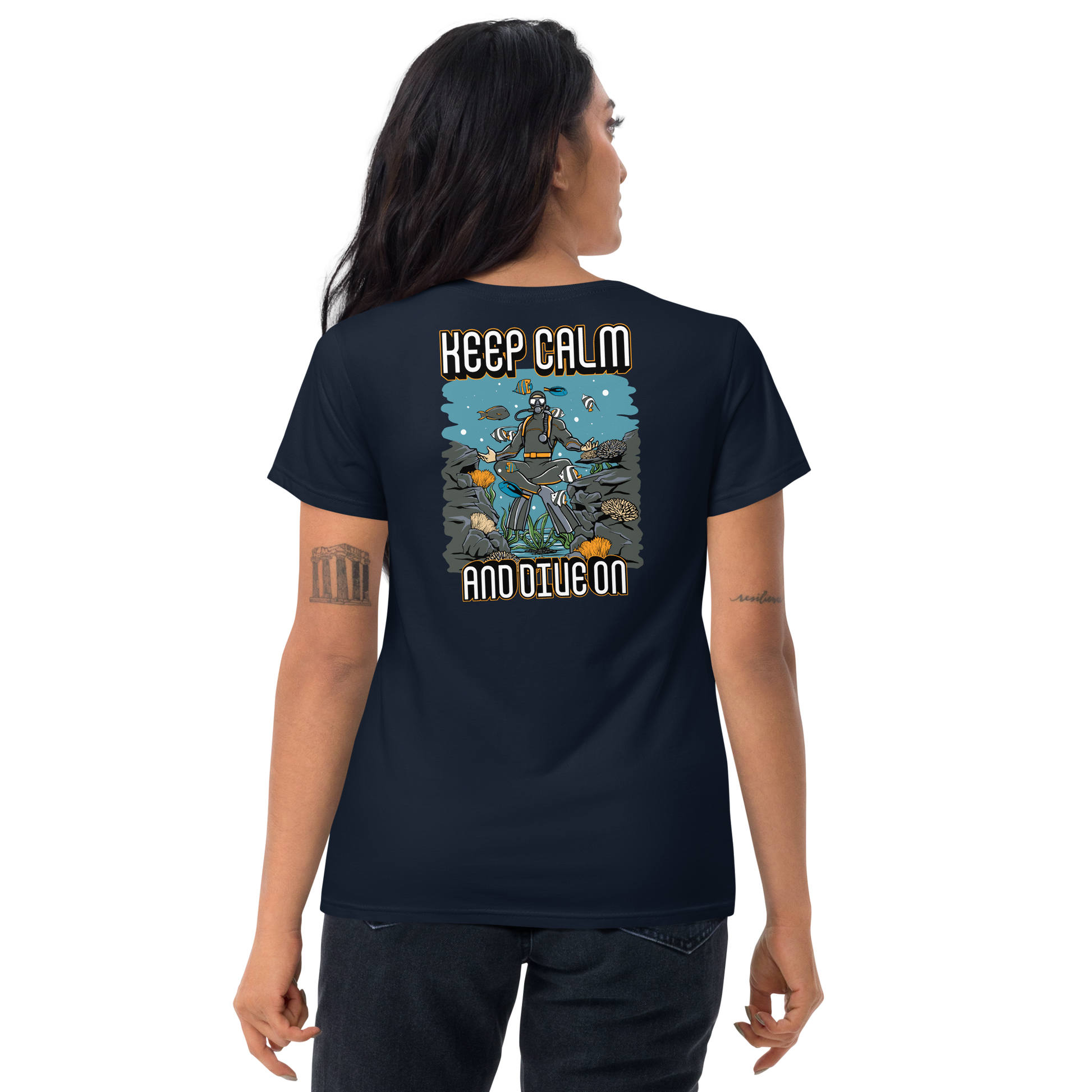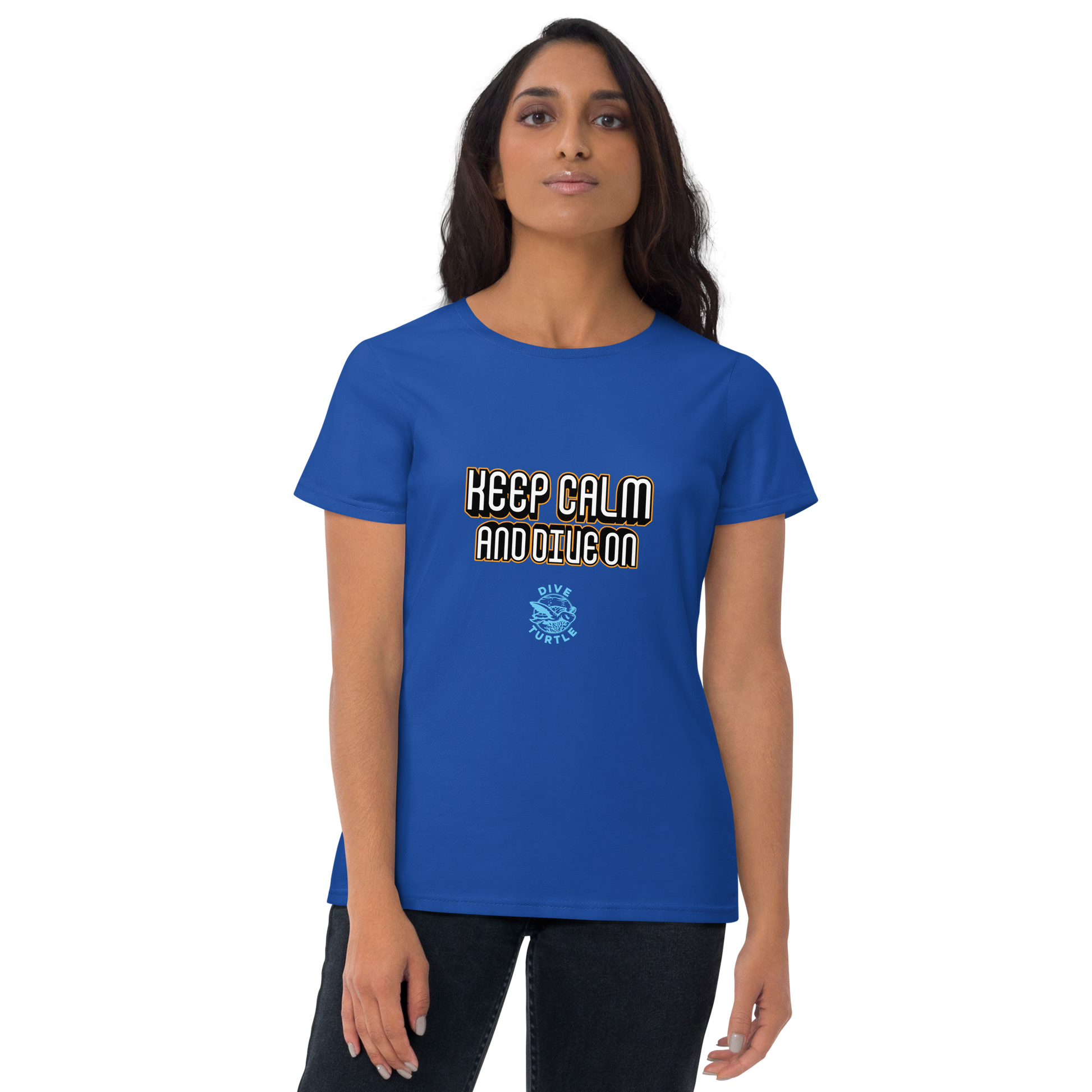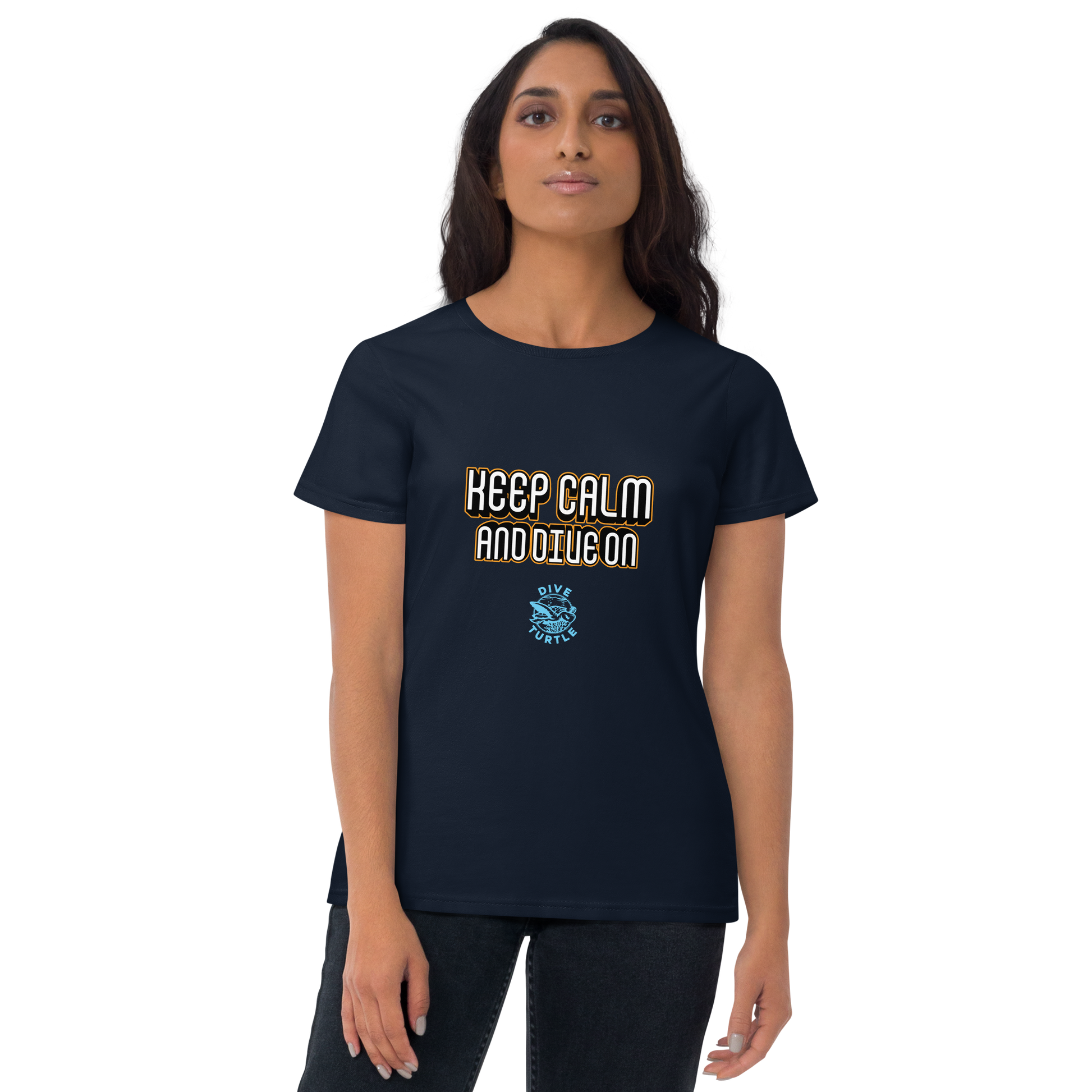 This tee shirt is perfect for anyone who loves diving and exploring the underwater world. The shirt is made of 100% cotton and has a comfortable fit. The front of the shirt features the slogan "Keep calm and dive on" in white letters, along with a diver in a Lotus pose. The slogan is inspired by the famous "Keep calm and carry on" poster from World War II, but with a twist of humor and adventure. Whether you are a professional diver, a hobbyist, or just a fan of the ocean, this tee shirt will show your passion and personality. You can wear it to the beach, the pool, or any casual occasion. Keep calm and dive on!