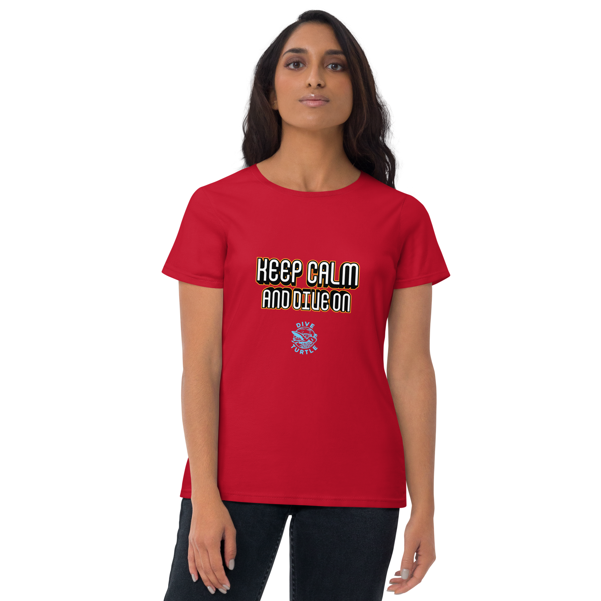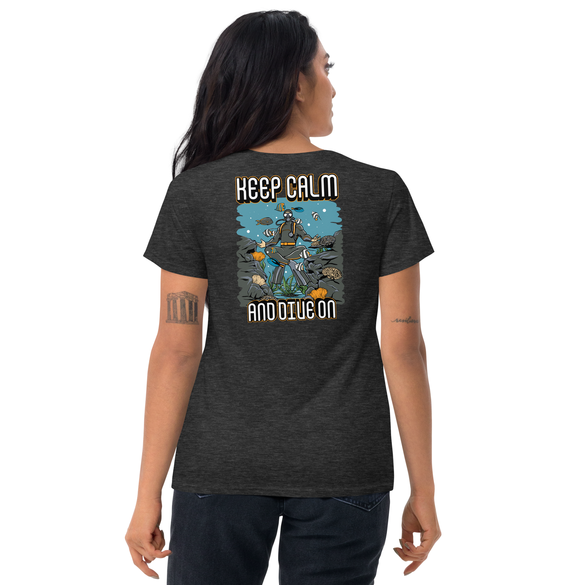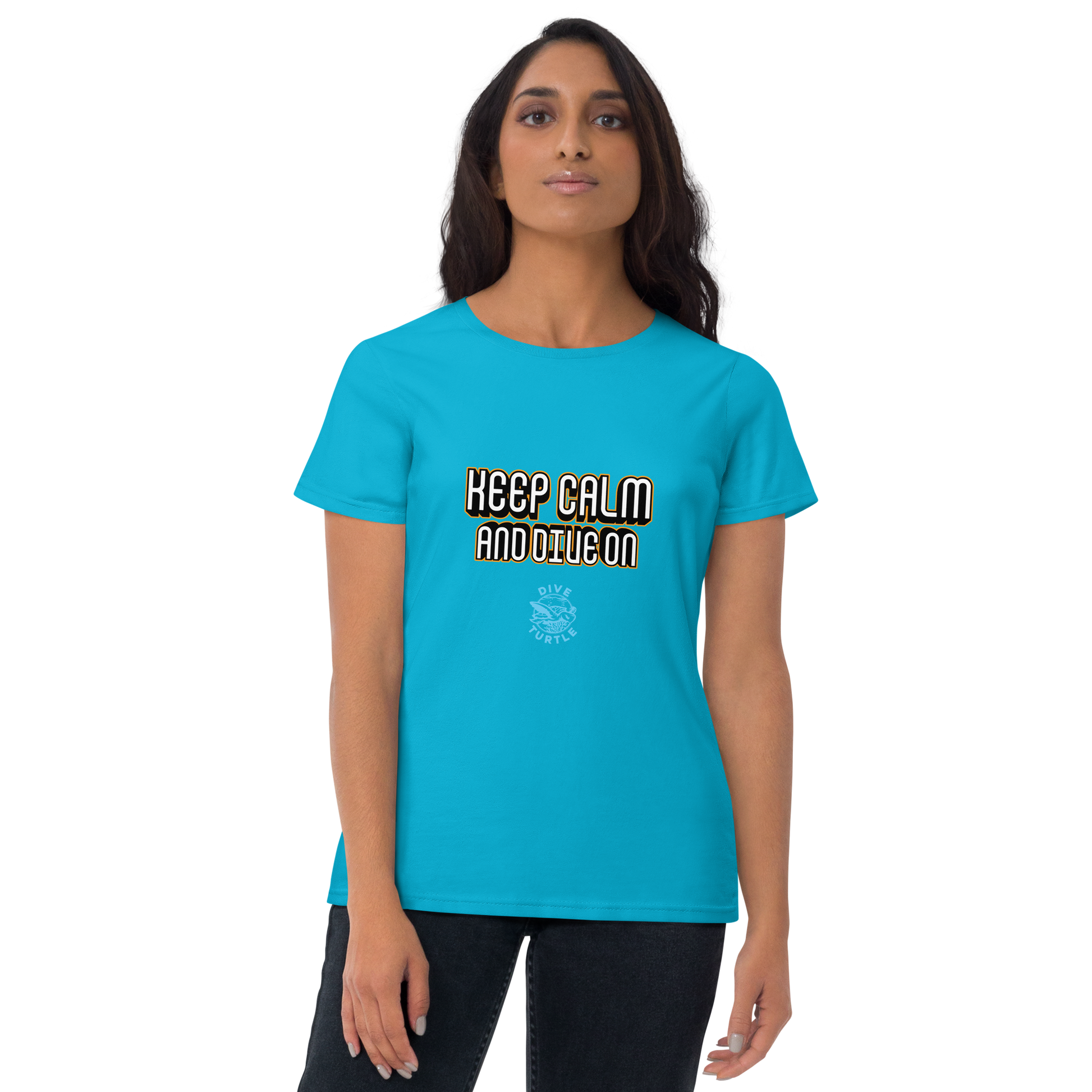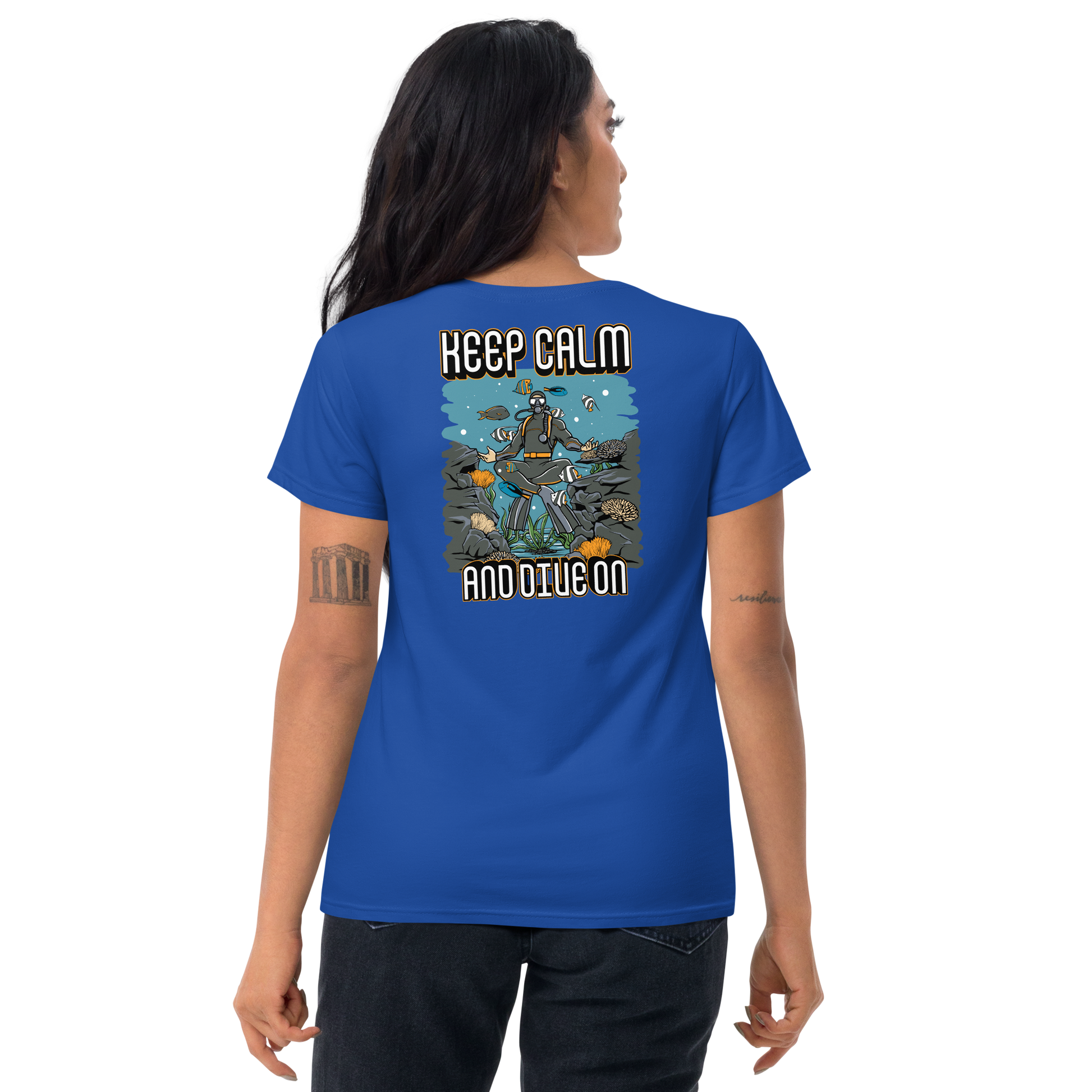 This tee shirt is perfect for anyone who loves diving and exploring the underwater world. The shirt is made of 100% cotton and has a comfortable fit. The front of the shirt features the slogan "Keep calm and dive on" in white letters, along with a diver in a Lotus pose. The slogan is inspired by the famous "Keep calm and carry on" poster from World War II, but with a twist of humor and adventure. Whether you are a professional diver, a hobbyist, or just a fan of the ocean, this tee shirt will show your passion and personality. You can wear it to the beach, the pool, or any casual occasion. Keep calm and dive on!